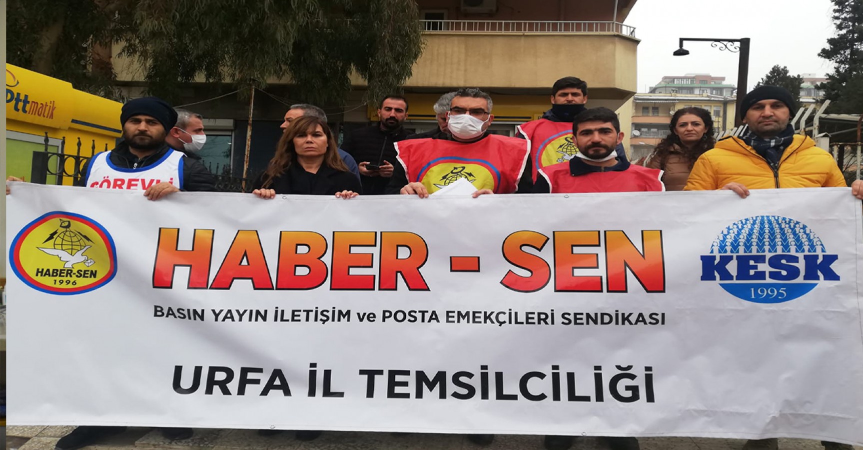 Basın, Yayın, İletişim ve Posta Emekçileri Sendikası (HABER-SEN) Şanlıurfa Şubesi üyeleri, Posta İşletmesi Genel Müdürlüğü çalışanlarının koşulları ve ücret taleplerine ilişkin Şanlıurfa PTT Başmüdürlüğü binası önünde açıklama yaptı.