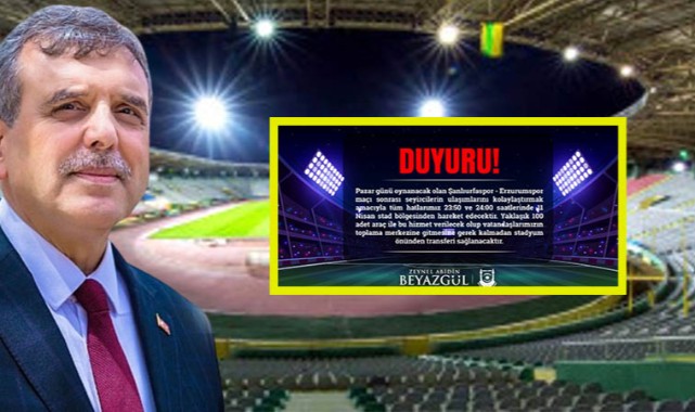 “Pazar günü oynanacak Şanlıurfaspor-Erzurumspor maçı sonrası seyircilerin ulaşımlarını kolaylaştırmak amacıyla tüm hatlarımız 23.50 ve 24.00 saatlerinde 11 Nisan Stad bölgesinden hareket edecektir. 100 adet araç ile bu hizmet verilecek olup vatandaşlarımızın toplama merkezlerine gitmesine gerek kalmadan stadyum önünden transferi sağlanacaktır.”