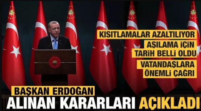 Cumhurbaşkanı Recep Tayyip Erdoğan başkanlığında toplanan yeni yılın ilk kabinesi sona erdi. Toplantısı sonrası koronavirüs kısıtlamalarının kademeli olarak azaltılacağını ifade eden Erdoğan 'İlk etapta 3 milyon doz aşı ülkemize geldi. Alman aşısıyla da anlaşmamızı yaptık. Görüşmeler devam ediyor. Perşembe veya Cuma olur diyor. Böylece belirlenen sıraya göre bu tarihte aşılar başlayacak.' dedi.